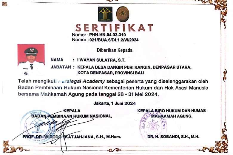 Bapak Perbekel telah tersertifikasi sebagai Non Litigation Paralegal - sebagai mediator sengketa masyarakat dan pemberi informasi hukum kepada masyarakat agar jika terjadi permasalahan tidak ke ranah Pengadilan